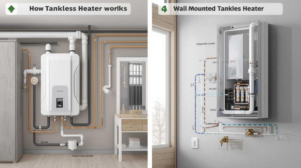 A Tankless Water Heater heats water only when you turn on a hot tap. Cold water flows into the unit, passes through a heat part, and a gas flame or electric coil heats the water right away. Because it does not store water in a tank, you get hot water on demand.