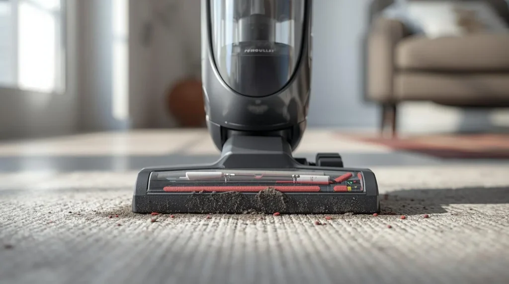 The brush roll spins and lifts dirt from the carpet. Hair and string wrap around it. Then it slows down or stops.